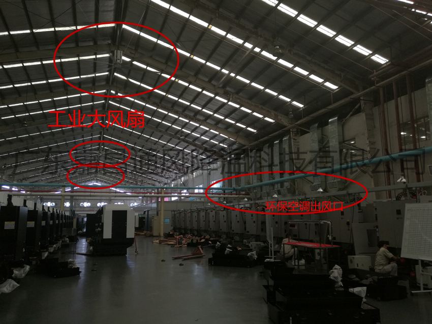 如果只安装瑞泰风大风扇,只能对人员进行感官降温,并不能将环境温度处理的很好。如果只安装润东方环保空调,可实现整体环境降温,但是管道太多,弄的车间不美观并且成本高。这时候我们就联想到把工业大风扇和环保空调相结合,通风降温、换气、美观、节约、安全都实现。这种方法对剧中高大车间室内空气改善具有重大意义和良好的经济实用价值。